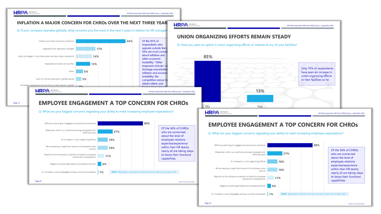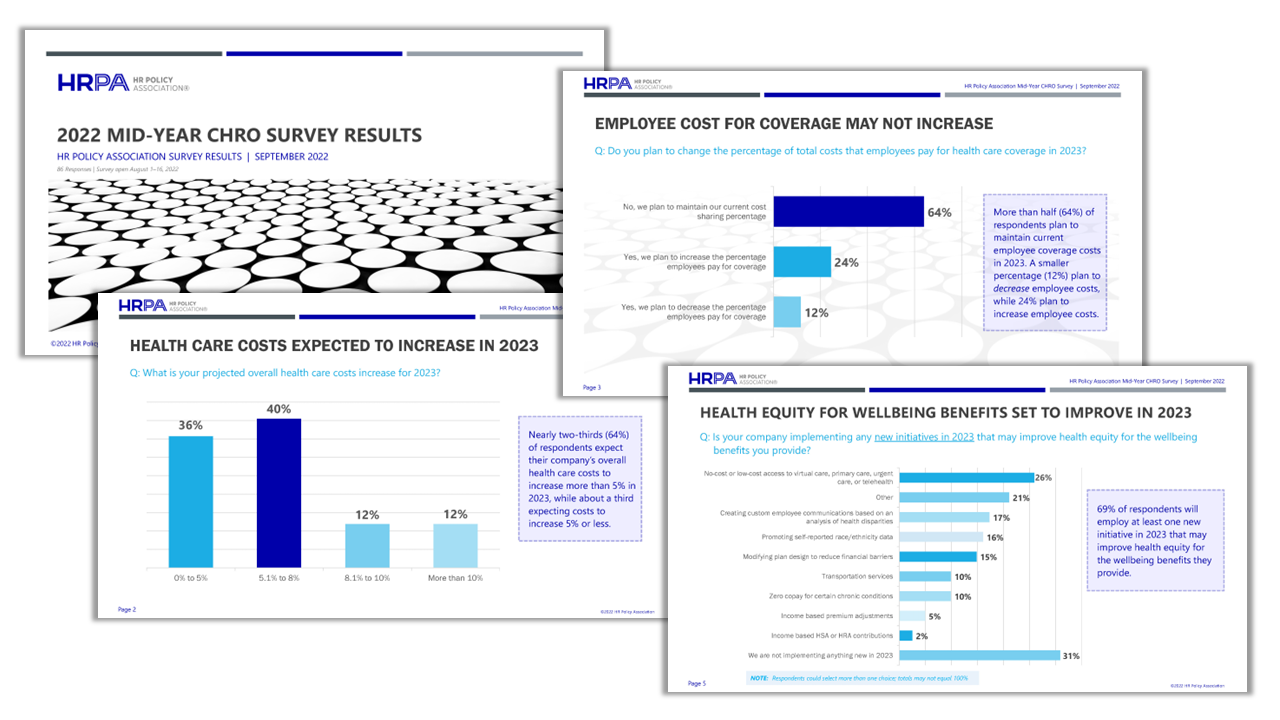 Each summer prior to our September Washington Policy Conference, the Association conducts a Mid-Year CHRO Survey linked to the issues that will be discussed at the upcoming meeting. This year’s survey focused on health equity and wellbeing, updated data on reproductive benefits following the Dobbs decision, and global and domestic trends on employee relations and ESG.