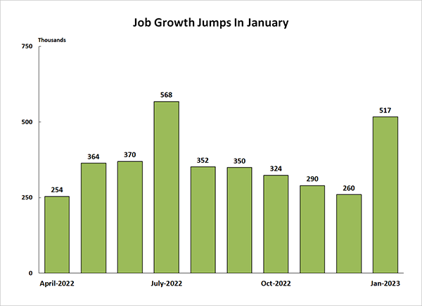 Wage increases moderating, but still elevated. Average hourly wages in January were 4.4% higher than a year earlier, down from a peak gain of 5.9% in March 2021. But a separate measure of compensation costs remains stubbornly high with wages and salary costs up 5.1% and benefit costs up 4.9% from a year-ago.