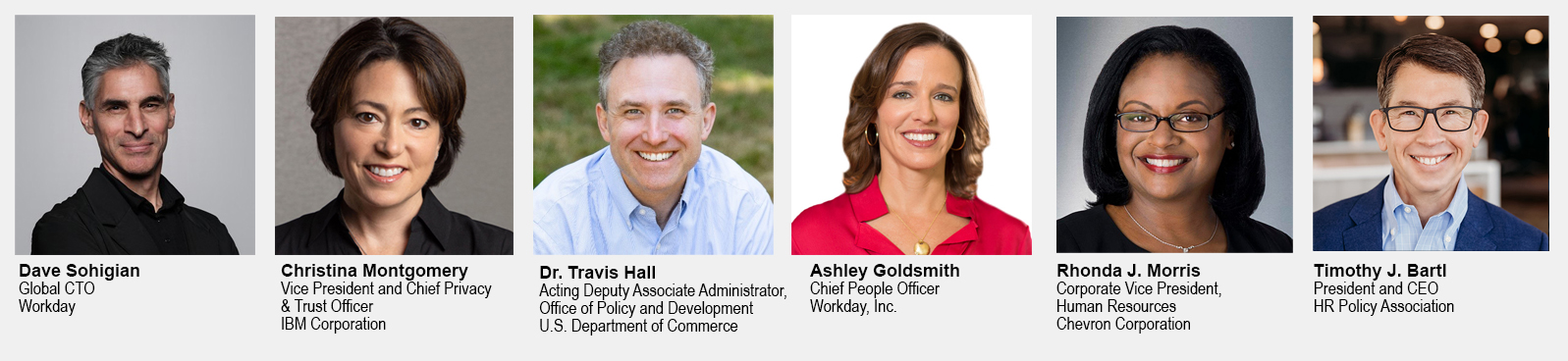 Christina Montgomery, Vice President and Chief Privacy and Trust officer, IBM Corporation, noted “companies need to adopt a set of principles around AI and how you are going to use AI.” She spoke about her experience developing governance principles around AI and its uses, and how it is important for AI to “augment and not replace humans.” Additionally, Ms. Montgomery spoke of how to manage the risks of AI, including important questions for HR to ask regarding the AI tools it is using, and the importance of adopting guardrails for foundation models (i.e., models that have broad capabilities and can be adapted to different uses) and generative AI.