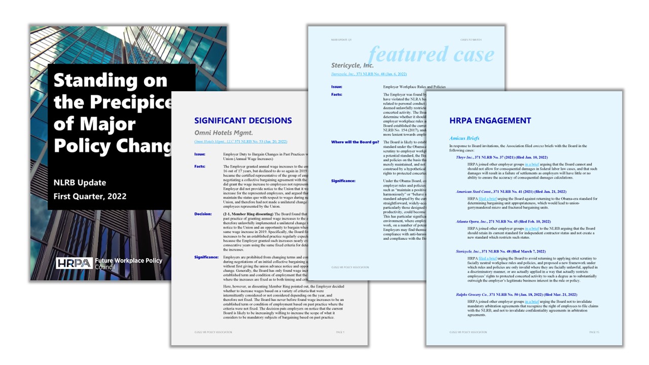 Welcome to the inaugural edition of HR Policy Association’s quarterly NLRB Report. Each report will provide a comprehensive update of law and policy developments at the National Labor Relations Board, including significant decisions issued by the Board, cases to watch, Office of General Counsel initiatives, rulemakings, and an overview of HR Policy’s engagement with the Board for that quarter. These reports will also feature expert analysis on a specific issue or topic from a guest writer.