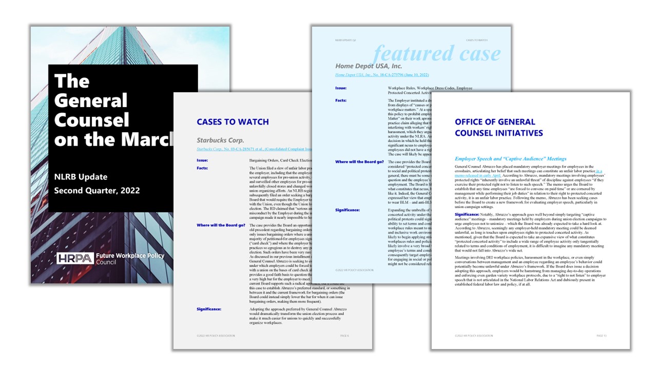 Welcome to the second edition of HR Policy Association’s quarterly NLRB Report. Each report provides a comprehensive update of law and policy developments at the National Labor Relations Board, including significant decisions issued by the Board, cases to watch, Office of General Counsel initiatives, rulemakings, and an overview of HR Policy’s engagement with the Board for that quarter. These reports also feature expert analysis on a specific issue or topic from a guest writer.